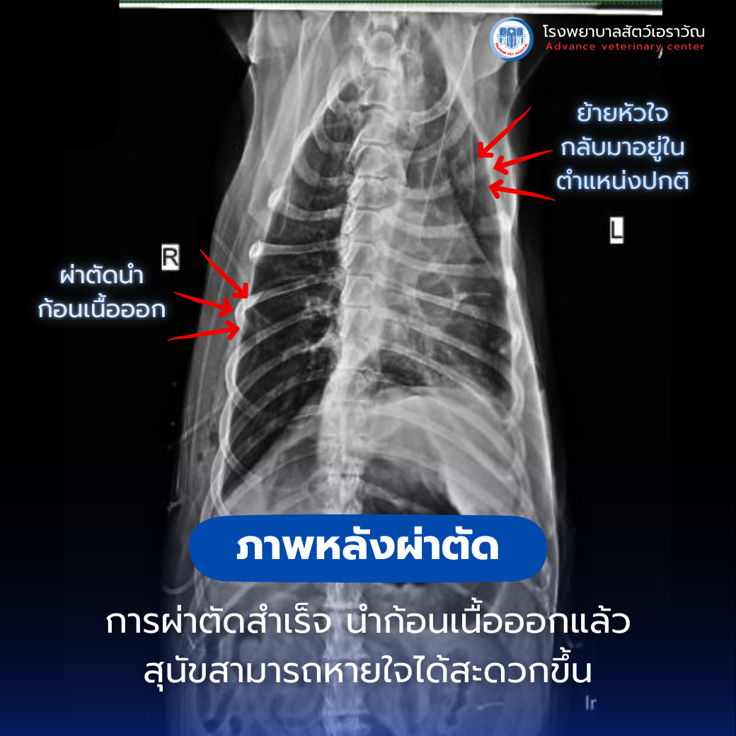 เคสนี้เป็นของสุนัขอายุ 15 ปี ที่เจ้าของพามาด้วยอาการหายใจลำบากและดูซึมลง จากการตรวจอย่างละเอียด พบว่าในช่องอกของน้องมีเนื้องอกขนาดใหญ่ที่อยู่ใต้หัวใจ เนื้องอกนี้ดันหัวใจไปอยู่ฝั่งขวาของทรวงอก และเมื่อผ่าตัดเข้าไปพบว่าเนื้องอกมีการแตกออกแล้ว มีเลือดออกจำนวนมาก พร้อมกับอาการติดเชื้อที่ทำให้โอกาสรอดชีวิตหลังการผ่าตัดค่อนข้างยาก