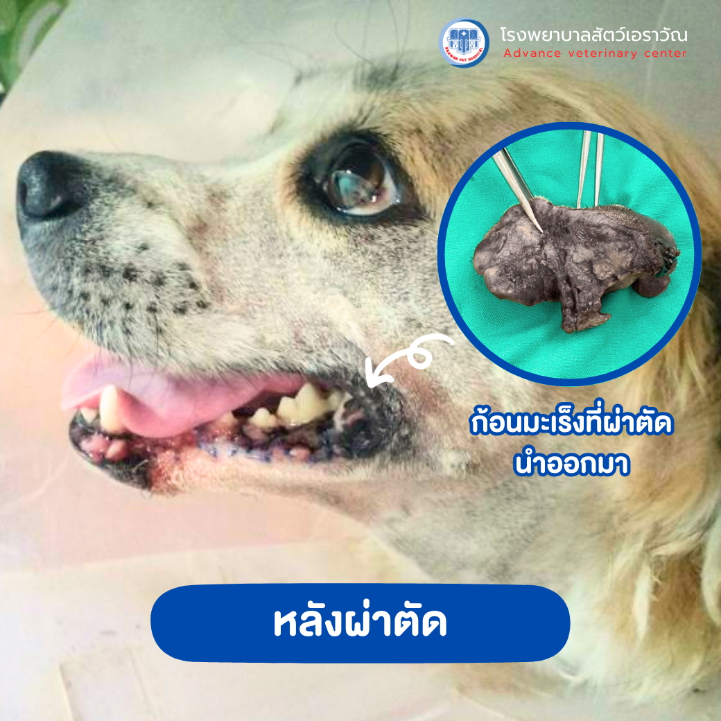 ก้อนเนื้อในช่องปากของสุนัขอาจเริ่มจากขนาดเล็ก แต่เมื่อเวลาผ่านไป ก้อนเนื้อนี้อาจโตขึ้นเรื่อยๆ และก่อให้เกิดอาการเจ็บปวด ส่งผลให้น้องหมาน้องกินอาหารได้น้อยลง อ่อนแรง และมีคุณภาพชีวิตที่แย่ลง จากกรณีตัวอย่างของน้องหมาในวัย 5 ปีขึ้นไปที่โรงพยาบาลสัตว์เอราวัณ ทีมสัตวแพทย์พบว่าน้องมีอาการเจ็บปากและกินอาหารลำบาก เมื่อตรวจวินิจฉัยอย่างละเอียดด้วยเทคโนโลยีทันสมัย เช่น การตรวจด้วยเซลล์วิทยา (Cytology) และการตัดชิ้นเนื้อ (Biopsy) พบว่า ก้อนเนื้อดังกล่าวมีเนื้อตาย (Necrosis) และมีแนวโน้มเป็นมะเร็งที่มีความเสี่ยงสูงต่อการลุกลามไปยังต่อมน้ำเหลืองหรืออวัยวะอื่นๆ เช่น ปอด หรือตับ