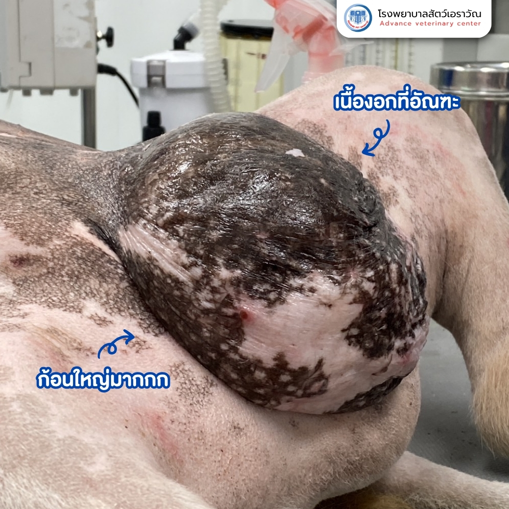โรงพยาบาลสัตว์เอราวัณได้รับเคสของน้องหมาอายุ 8 ปี ที่เจ้าของสังเกตเห็นว่าบริเวณอัณฑะมีความผิดปกติ บวมโตและมีก้อนแข็ง เมื่อสอบถามประวัติพบว่าน้องเคยทำหมันไปตั้งแต่วัยหนุ่มแล้ว แต่ยังพบว่ามีก้อนเกิดขึ้นในตำแหน่งเดิม
