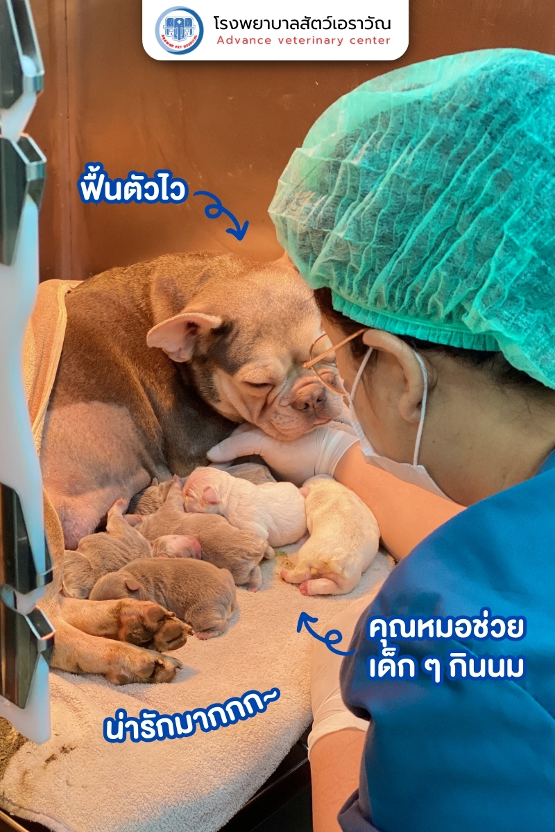 หลังการผ่าคลอด แม่สุนัขไม่ได้ถูกปล่อยให้พักเพียงลำพัง แต่ได้รับการ มอนิเตอร์อย่างต่อเนื่องจนถึงเช้า ทั้ง