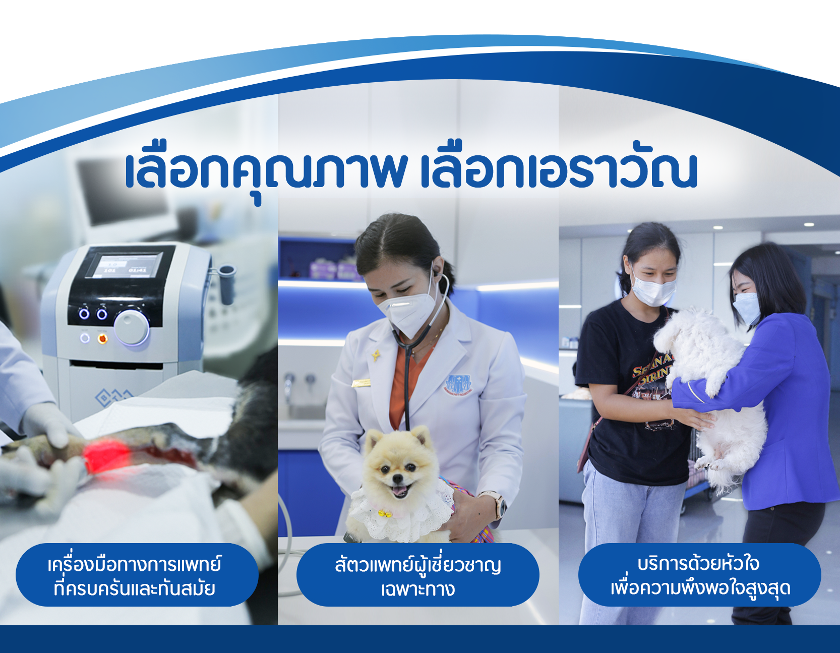 ส่งมอบคุณภาพการรักษาที่ถูกต้องตามหลักวิชาการ วินิจฉัยหาสาเหตุของโรค เพื่อรักษาที่ต้นเหตุอย่างถูกต้องและแม่นยำ นวัตกรรมและเทคโนโลยี และการเอื้ออาทร ให้บริการดูแลใส่ใจสัตว์เลี้ยงดุจสมาชิกในครอบครัว มีเครื่องมือและอุปกรณ์ที่ครบครัน และทันสมัย